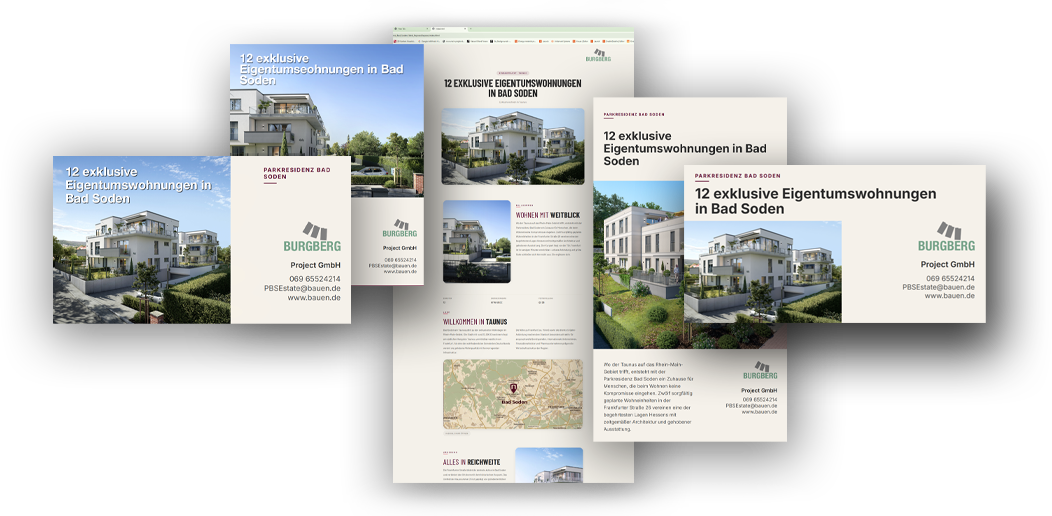 Projektdaten eingeben, Unterlagen hochladen – fertig. Sie erhalten PDF, Web-Link, HTML-Website-Paket und Social-Media-Paket.